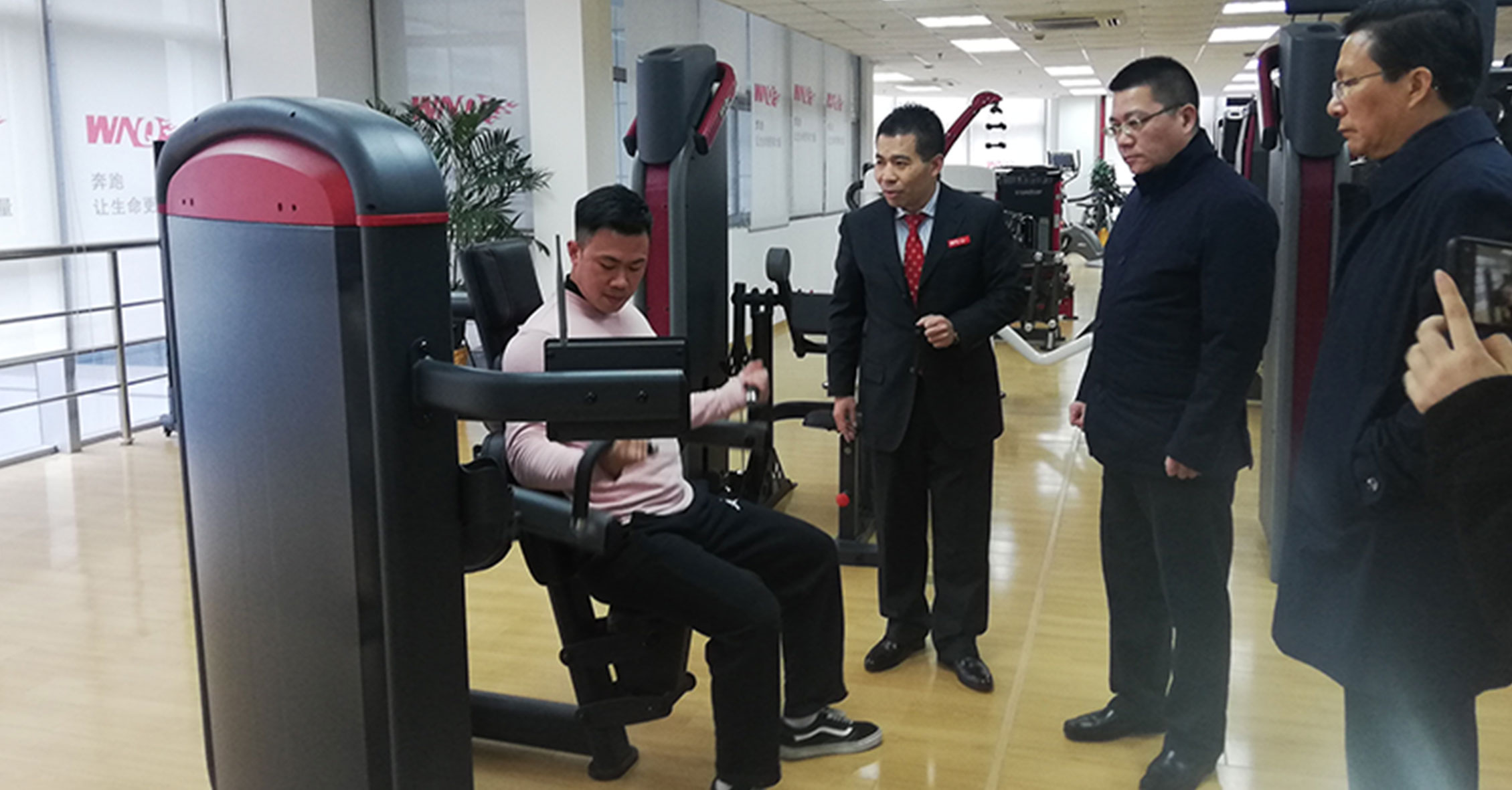 许副局长一行先参观了jiuyou.com九游器材展厅,对我们的企业文化、发展情况、健身器材产品等进行了详细了解,并重点关注了2018年jiuyou.com九游推出的F1-7000美格力量单站系列、W2000变形金刚系列和F4、F6跑步机等新品,jiuyou.com九游的力量单站产品大管径的优质选材、源自美国的外形设计和新品跑步机的智能化等特点深得领导一行的肯定。